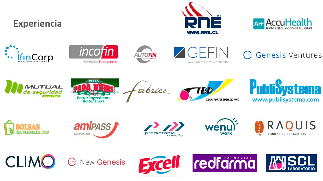 - Asesor de empresas de distintas industrias como: factorig & leasing, financieras automotrices, retail, decoración textil hogar, importadoras, comercializadoras, laboratorios, productoras y fabriles, ingeniería, entretención, salud digital, etc.